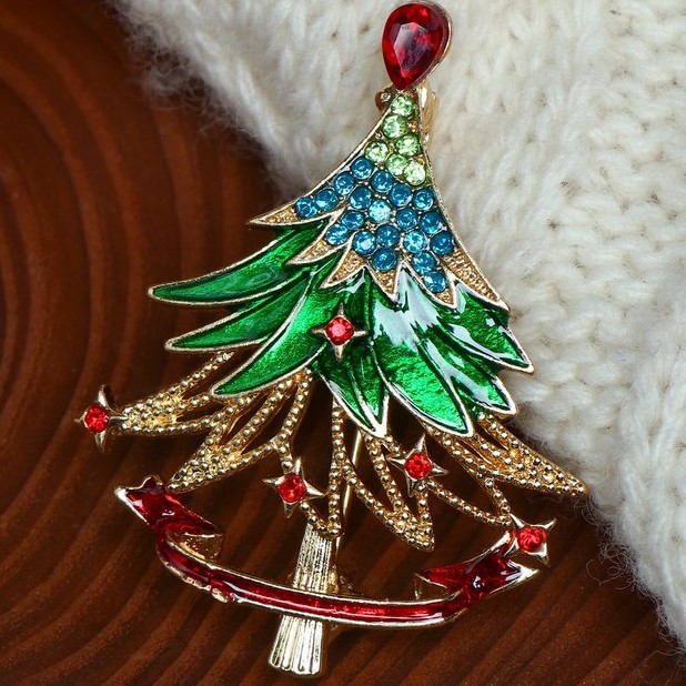 Брошь новогодняя "Ёлка" острые ветки, цветная в золоте