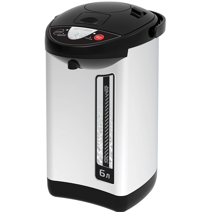 индикаторами уровня воды и нагрева, функцией поддержания температуры и защиты от перегрева. Чайник-термос снабжён пластиковой ручкой