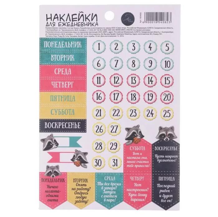 Наклейки для ежедневника «Дни недели», 11 × 16 см