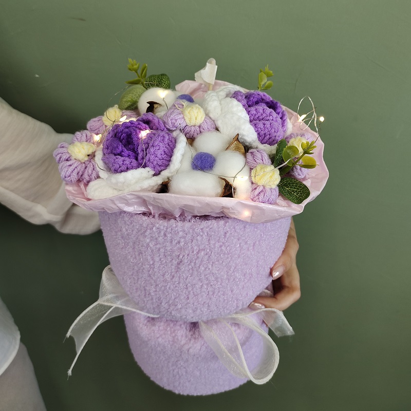 Букет плюшевый с цветами, фиолетовый ПАКЕТ+ГИРЛЯНДА 1м (Уп-35*25*15)