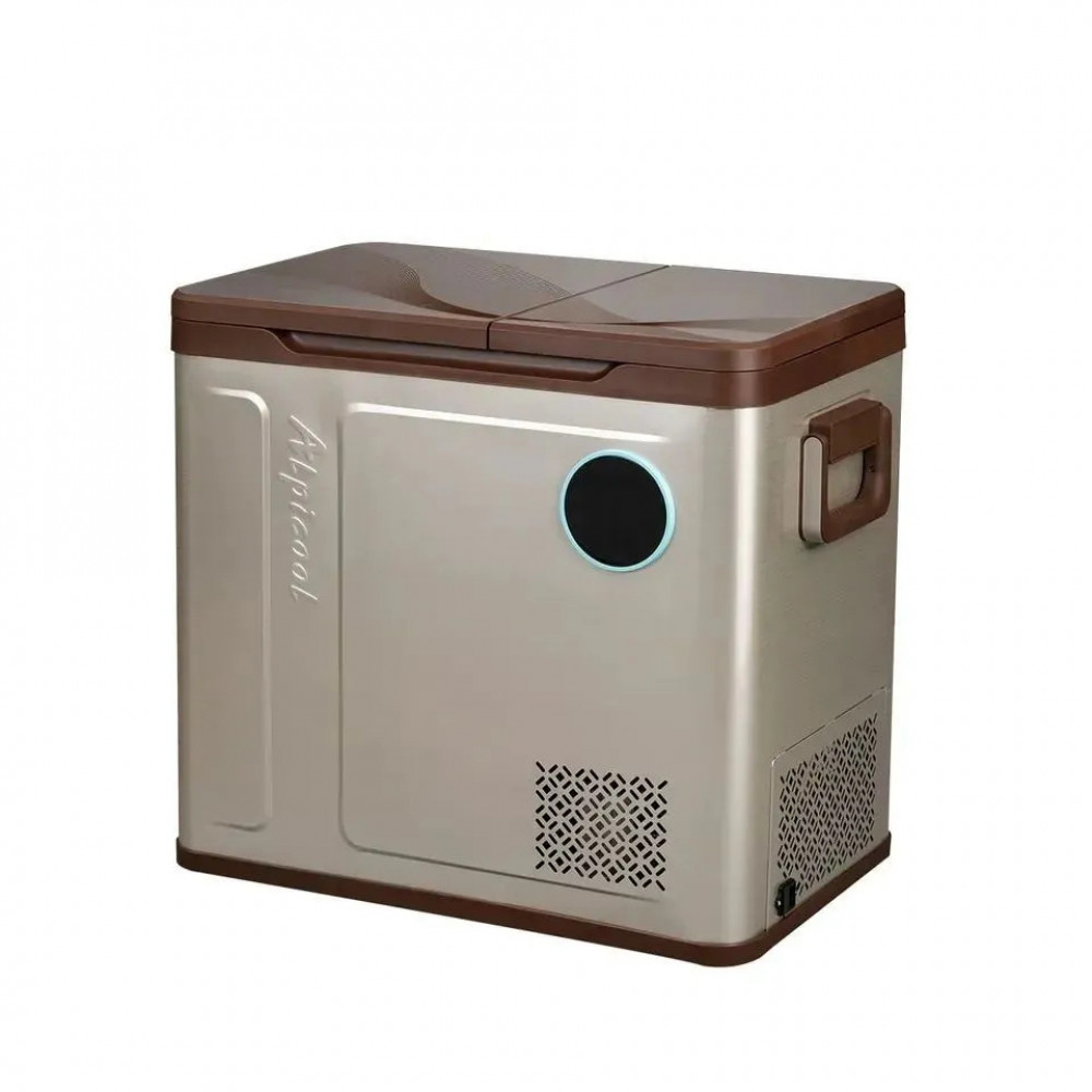Alpicool WH58 (12/24) выделяется современным, минималистичным дизайном. Он компактный, поэтому легко размещается в багажнике или салоне, а круглый светодиодный интуитивно понятный дисплей сразу привлекает внимание. Дополнительный плюс — демпфирующие дверные петли для плавного закрытия дверцы и снижения уровня шума, а также удобные ручки для переноски.