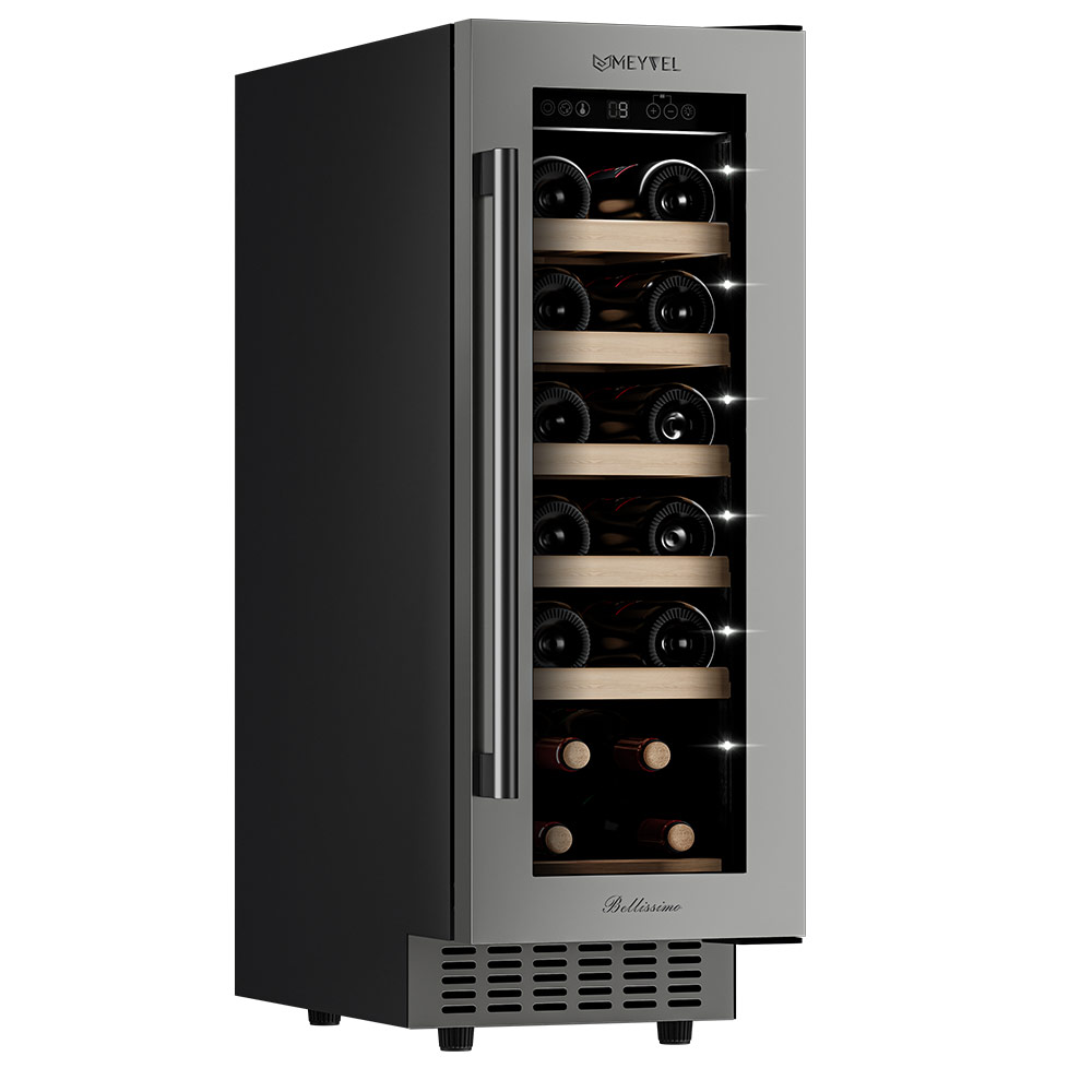 Компрессорный винный шкаф Meyvel MV19-KST1 обладает оптимальной вместимостью и даёт возможность разместить до 19 бутылок стандартного типа Бордо (0,75 л). Располагаются они на выдвижных полках из дерева. Внутреннее пространство шкафа поддерживает комфортную для вина температуру от +5°C до +20°C. Так же, эта модель поддерживает влажность в диапазоне 60-80%, как в настоящем винном погребе.